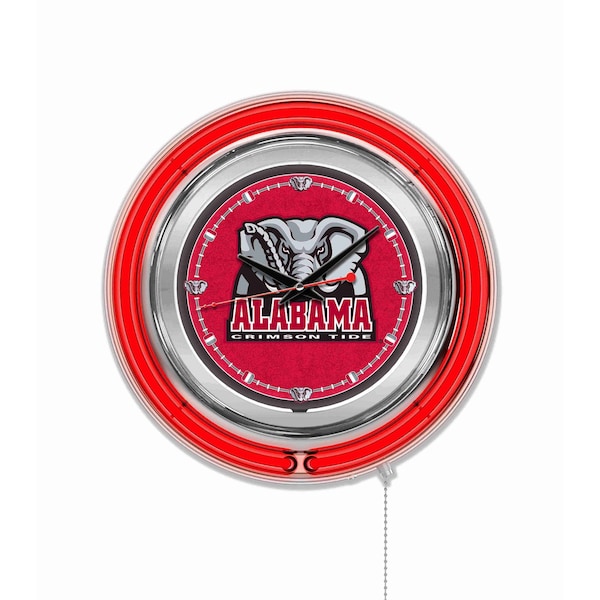 Our double neon Logo Clocks are the perfect way to show your school pride. Featuring a chrome casing and a team color specific neon outer ring that accents the custom printed clock face which is lit up by an brilliant white, inner neon ring. The Neon rings are easily turned on and off with a pull chain on the bottom of the clock, and are powered by a UL Listed power transformer that runs off standard 120V outlet. Accurate quartz movement ensures proper time and is powered by a single, AA battery (not included). Whether purchasing as a gift for a recent grad, sports super fan, or for yourself, you can take satisfaction knowing you're buying a clock that is proudly made by the Holland Bar Stool Company.