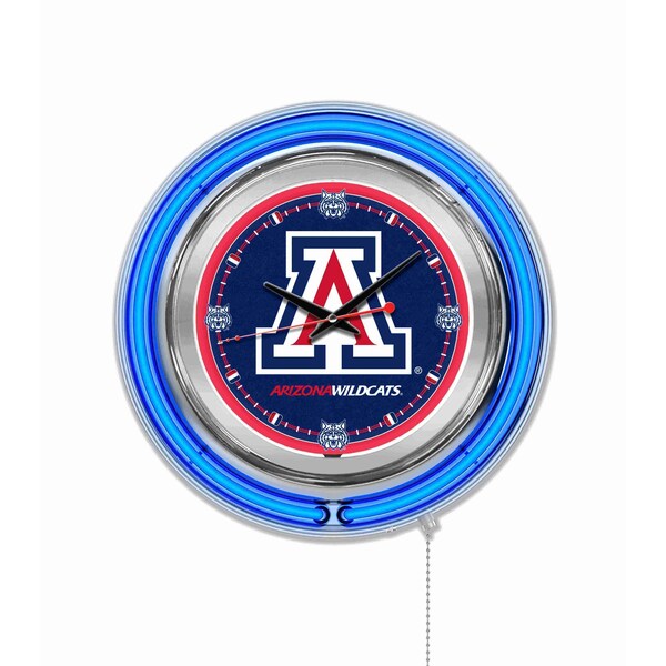 Our double neon Logo Clocks are the perfect way to show your school pride. Featuring a chrome casing and a team color specific neon outer ring that accents the custom printed clock face which is lit up by an brilliant white, inner neon ring. The Neon rings are easily turned on and off with a pull chain on the bottom of the clock, and are powered by a UL Listed power transformer that runs off standard 120V outlet. Accurate quartz movement ensures proper time and is powered by a single, AA battery (not included). Whether purchasing as a gift for a recent grad, sports super fan, or for yourself, you can take satisfaction knowing you're buying a clock that is proudly made by the Holland Bar Stool Company.