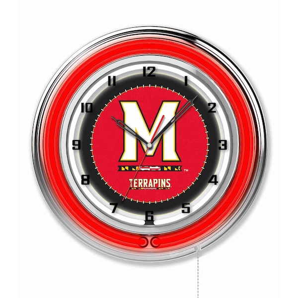 Our double neon Logo Clocks are the perfect way to show your school pride. Featuring a chrome casing and a team color specific neon outer ring that accents the custom printed clock face which is lit up by an brilliant white, inner neon ring. The Neon rings are easily turned on and off with a pull chain on the bottom of the clock, and are powered by a UL Listed power transformer that runs off standard 120V outlet. Accurate quartz movement ensures proper time and is powered by a single, AA battery (not included). Whether purchasing as a gift for a recent grad, sports super fan, or for yourself, you can take satisfaction knowing you're buying a clock that is proudly made by the Holland Bar Stool Company.