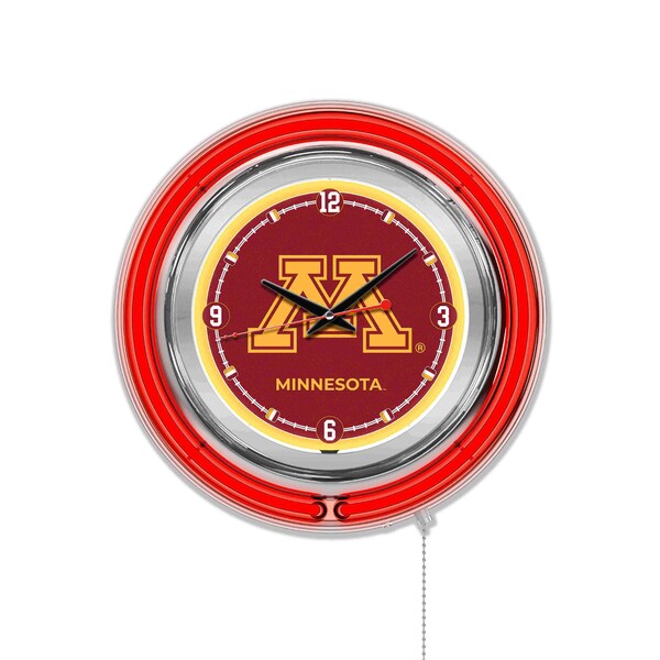 Our double neon Logo Clocks are the perfect way to show your school pride. Featuring a chrome casing and a team color specific neon outer ring that accents the custom printed clock face which is lit up by an brilliant white, inner neon ring. The Neon rings are easily turned on and off with a pull chain on the bottom of the clock, and are powered by a UL Listed power transformer that runs off standard 120V outlet. Accurate quartz movement ensures proper time and is powered by a single, AA battery (not included). Whether purchasing as a gift for a recent grad, sports super fan, or for yourself, you can take satisfaction knowing you're buying a clock that is proudly made by the Holland Bar Stool Company.