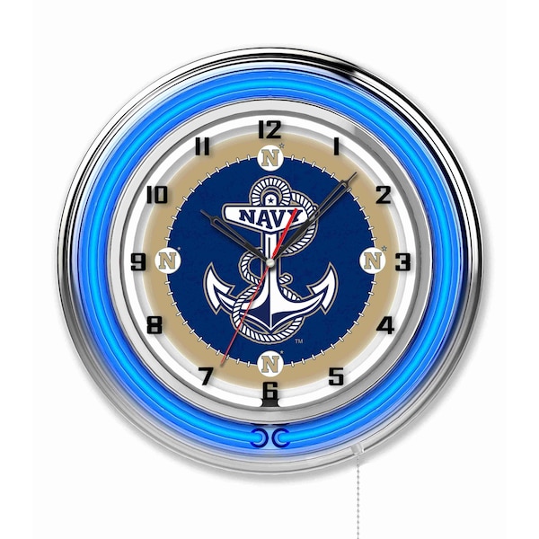 Our double neon Logo Clocks are the perfect way to show your school pride. Featuring a chrome casing and a team color specific neon outer ring that accents the custom printed clock face which is lit up by an brilliant white, inner neon ring. The Neon rings are easily turned on and off with a pull chain on the bottom of the clock, and are powered by a UL Listed power transformer that runs off standard 120V outlet. Accurate quartz movement ensures proper time and is powered by a single, AA battery (not included). Whether purchasing as a gift for a recent grad, sports super fan, or for yourself, you can take satisfaction knowing you're buying a clock that is proudly made by the Holland Bar Stool Company.