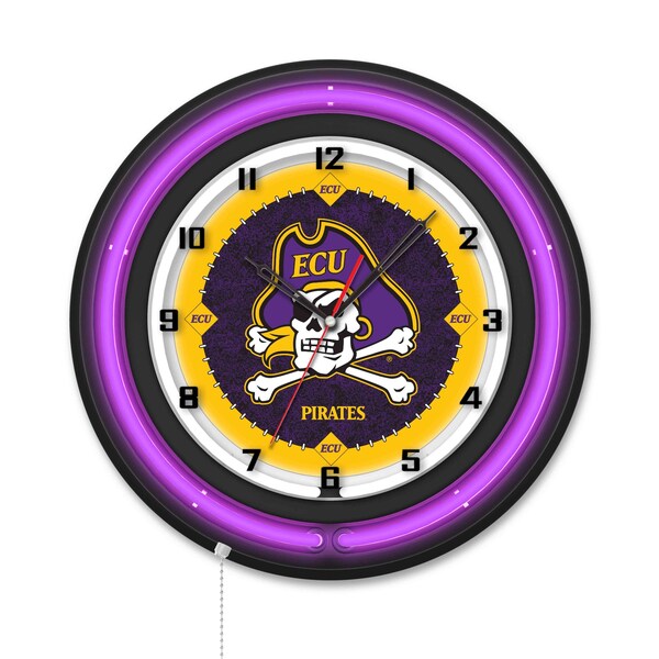 Our double neon Logo Clocks are the perfect way to show your school pride. Featuring a Black casing and a team color specific neon outer ring that accents the custom printed clock face which is lit up by an brilliant white, inner neon ring. The Neon rings are easily turned on and off with a pull chain on the bottom of the clock, and are powered by a UL Listed power transformer that runs off standard 120V outlet. Accurate quartz movement ensures proper time and is powered by a single, AA battery not included. Whether purchasing as a gift for a recent grad, sports super fan, or for yourself, you can take satisfaction knowing you're buying a clock that is proudly made by the Holland Bar Stool Company in Holland, MI