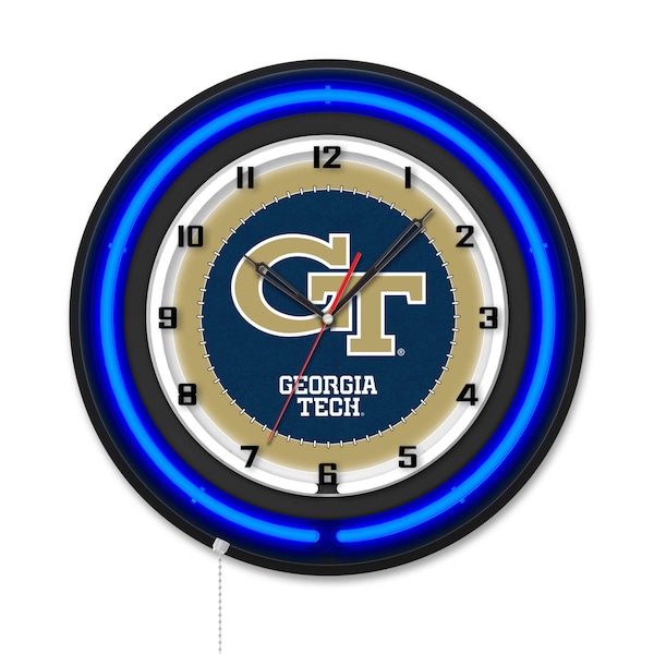 Our double neon Logo Clocks are the perfect way to show your school pride. Featuring a Black casing and a team color specific neon outer ring that accents the custom printed clock face which is lit up by an brilliant white, inner neon ring. The Neon rings are easily turned on and off with a pull chain on the bottom of the clock, and are powered by a UL Listed power transformer that runs off standard 120V outlet. Accurate quartz movement ensures proper time and is powered by a single, AA battery not included. Whether purchasing as a gift for a recent grad, sports super fan, or for yourself, you can take satisfaction knowing you're buying a clock that is proudly made by the Holland Bar Stool Company in Holland, MI
