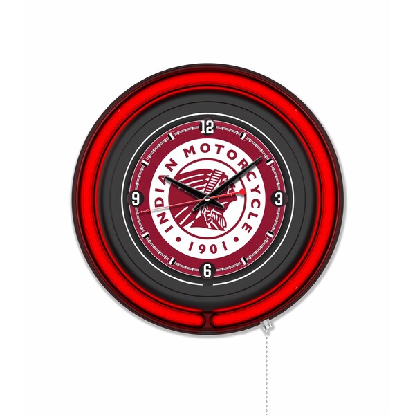 Our double neon Indian Motorcycle Logo Clocks are the perfect way to show where your loyalty stands. Featuring a Black casing and a vibrant red neon outer ring that accents the custom printed clock face which is lit up by an brilliant white, inner neon ring. The Neon rings are easily turned on and off with a pull chain on the bottom of the clock, and are powered by a UL Listed power transformer that runs off standard 120V outlet. Accurate quartz movement ensures proper time and is powered by a single, AA battery not included. Whether purchasing as a gift for a previous or current Indian rider/admirer or for yourself, you can take satisfaction knowing you're buying a clock that is proudly made by the Holland Bar Stool Company in Holland, MI