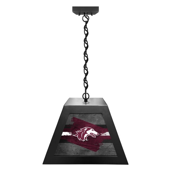 Metal frame construction paired with a bright backlit design creates a high-quality, suspended light fixture ideal for billiard tables, game tables, and bars, and pub tables. This Pendant Box Light measures 17 L x 17 W x 12 H with a 4.75 x 4.75 ceiling mount and 9 6 cord with 3-pronged polarized plug. 120V, ETL approved. The heavy-duty metal frame, ceiling mount, and durable hanging chain to conceal the cord are a sleek black finish. Each hanging chain measures 45 for versatility. All hardware is included. On/off pull chain measures 10 for easy access and operation. Thick, shatter-resistant acrylic panels are digitally printed with UV cured ink for superior vibrancy. Graphics are illuminated by a single 60W bulb not included. Select from our list of officially licensed logos. Custom imprinting is also available.