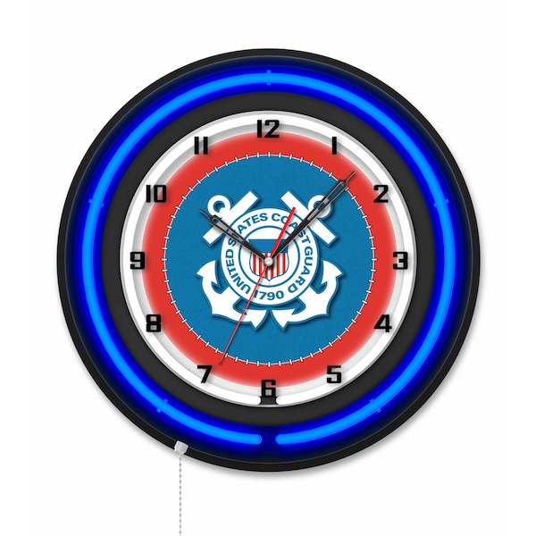 Our double neon Logo Clocks are the perfect way to show your support for our troops. Featuring a Black casing and a color specific neon outer ring that accents the custom printed clock face which is lit up by an brilliant white, inner neon ring. The Neon rings are easily turned on and off with a pull chain on the bottom of the clock, and are powered by a UL Listed power transformer that runs off standard 120V outlet. Accurate quartz movement ensures proper time and is powered by a single, AA battery not included. You can take satisfaction knowing you're buying a clock that is proudly made by the Holland Bar Stool Company in Holland, MI