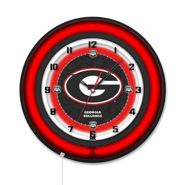 Our double neon Logo Clocks are the perfect way to show your school pride. Featuring a Black casing and a team color specific neon outer ring that accents the custom printed clock face which is lit up by an brilliant white, inner neon ring. The Neon rings are easily turned on and off with a pull chain on the bottom of the clock, and are powered by a UL Listed power transformer that runs off standard 120V outlet. Accurate quartz movement ensures proper time and is powered by a single, AA battery not included. Whether purchasing as a gift for a recent grad, sports super fan, or for yourself, you can take satisfaction knowing you're buying a clock that is proudly made by the Holland Bar Stool Company in Holland, MI