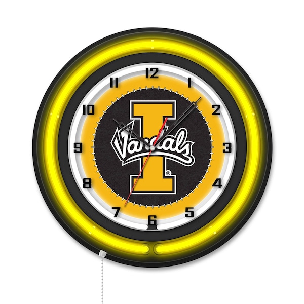 Our double neon Logo Clocks are the perfect way to show your school pride. Featuring a Black casing and a team color specific neon outer ring that accents the custom printed clock face which is lit up by an brilliant white, inner neon ring. The Neon rings are easily turned on and off with a pull chain on the bottom of the clock, and are powered by a UL Listed power transformer that runs off standard 120V outlet. Accurate quartz movement ensures proper time and is powered by a single, AA battery not included. Whether purchasing as a gift for a recent grad, sports super fan, or for yourself, you can take satisfaction knowing you're buying a clock that is proudly made by the Holland Bar Stool Company in Holland, MI