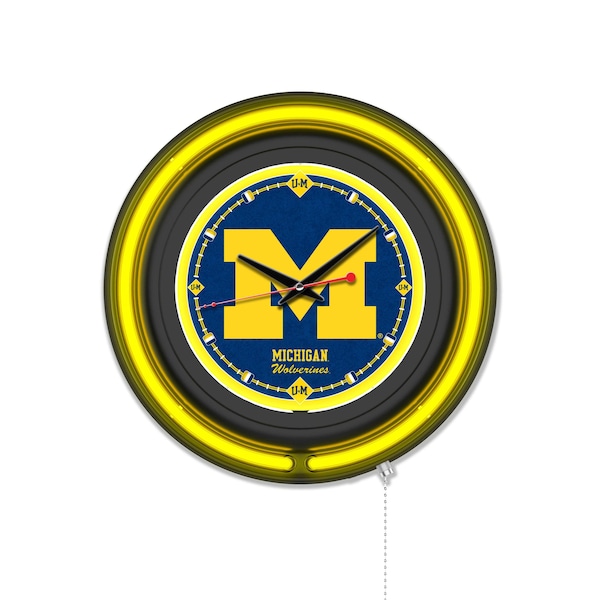Our double neon Logo Clocks are the perfect way to show your school pride. Featuring a Black casing and a team color specific neon outer ring that accents the custom printed clock face which is lit up by an brilliant white, inner neon ring. The Neon rings are easily turned on and off with a pull chain on the bottom of the clock, and are powered by a UL Listed power transformer that runs off standard 120V outlet. Accurate quartz movement ensures proper time and is powered by a single, AA battery not included. Whether purchasing as a gift for a recent grad, sports super fan, or for yourself, you can take satisfaction knowing you're buying a clock that is proudly made by the Holland Bar Stool Company in Holland, MI