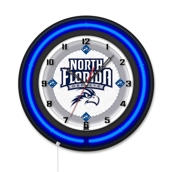 Our double neon Logo Clocks are the perfect way to show your school pride. Featuring a Black casing and a team color specific neon outer ring that accents the custom printed clock face which is lit up by an brilliant white, inner neon ring. The Neon rings are easily turned on and off with a pull chain on the bottom of the clock, and are powered by a UL Listed power transformer that runs off standard 120V outlet. Accurate quartz movement ensures proper time and is powered by a single, AA battery not included. Whether purchasing as a gift for a recent grad, sports super fan, or for yourself, you can take satisfaction knowing you're buying a clock that is proudly made by the Holland Bar Stool Company in Holland, MI