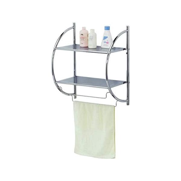 Maximize the space in the bathroom with this 2 tier wall mounting shelf that helps free up space on the vanity by corralling everything from small hair styling tools, make up, bottled medicine, decorative vases, and more The curved frame is constructed