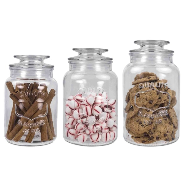 Keep dry food snacks organized and fresh with this canister jar They are made from durable glass with clear walls to easily glance at what is inside Store everything from chips, candy, cookies, pretzels, and pet treats The canisters are equipped w