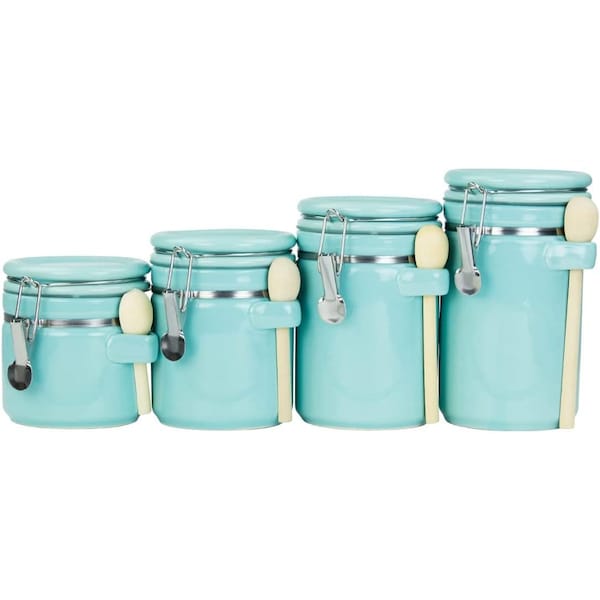 4 Piece Ceramic Canister Set with Wooden Spoons, Turquoise