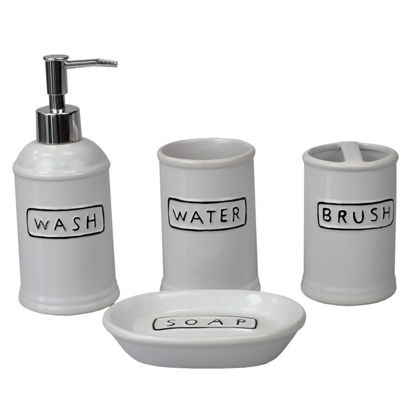 Bring resortlike comfort to your bathroom with this 4 Piece Bath Ensemble The set comes complete with a lotionsoap dispenser, tumbler, toothbrush holder, soap tray A great gift to give to friends and family Perfect way to bring style and convenience