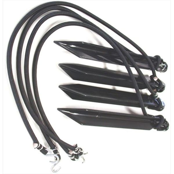 A set of four 10-inch boundary plastic stakes with 2-foot of bungee cord attached and small s-hook on one end.