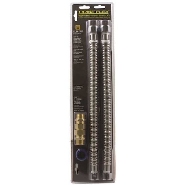 This is an Electric Water Heater Installation Kit by HOME-FLEX. It contains 2 flexible water connectors. This kit makes it easier to install your water heater.Kit contains two 3/4 in. FIP x 3/4 in. FIP x 18 in. long corrugated stainless steel water connectors that can be used for both hot and or cold water connectionsIncludes 2 compression adapters for making connections to 3/4 in. copper water pipesWhite thread sealing tape includedBright stainless steel finish on water connectorsFor electric water heatersDurable constructionFull kitFittings includedEasy to useFemale threaded ends