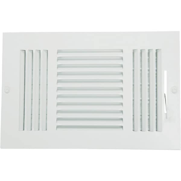 Stamped steel construction with turnback frame. 3-way airflow pattern. 2 grille bars to an inch. Stamped 1-piece face with multilouvered damper. Metal handle. White. Size in description is rough opening size actual product back is 1/4 smaller.