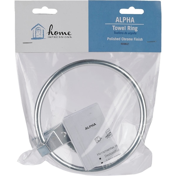 Alpha series zinc die-cast wall mount towel ring with exposed mounting screws. Mounting hardware included. Easy installation. 7 In. H x 6.06 In. Dia. Bagged. Chrome finish.
