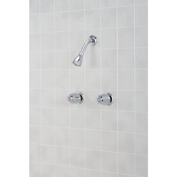 2-handle metallic shower faucet with metal handles. 1.75 GPM (gallons per minute) maximum at 80 psi (pounds per square inch). WaterSense certified. Compression faucet for use in low water pressure and hard water areas. Solid brass construction brass waterways compression cartridge. Includes shower arm flange and showerhead. Chrome finish. Meets CUPC (Uniform Plumbing Code Canadian) certification. Manufactured to include no more than 0.25% weighted average lead content on wetted surfaces.