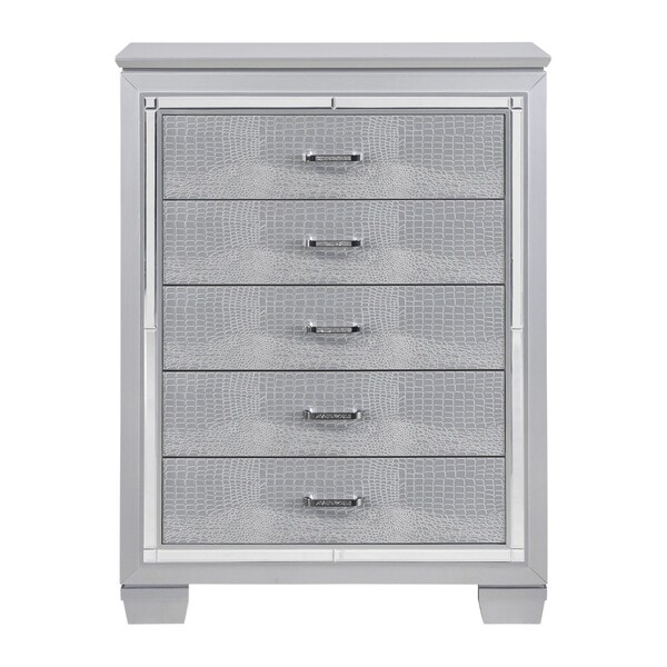Glamour reigns in the design of the Allura Collection. Framing chest is a decorative beveled mirror accent. The alligator embossing of the drawer fronts is paired with high-polished crystal-enhanced hardware that boldly decorates the silver finish.