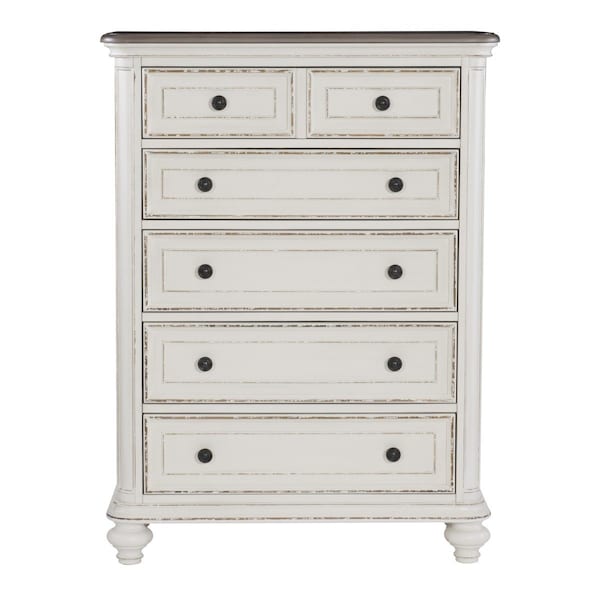 Soft, sweeping curves define the elegant profile of the Baylesford Collection. The chest is softened by an antique white rub-through finish with a brown-gray finished framed-plank top, creating a romantic aesthetic will place beautifully within your bedroom. Dark finished metal knob hardware provides complementing contrast to the drawer fronts.