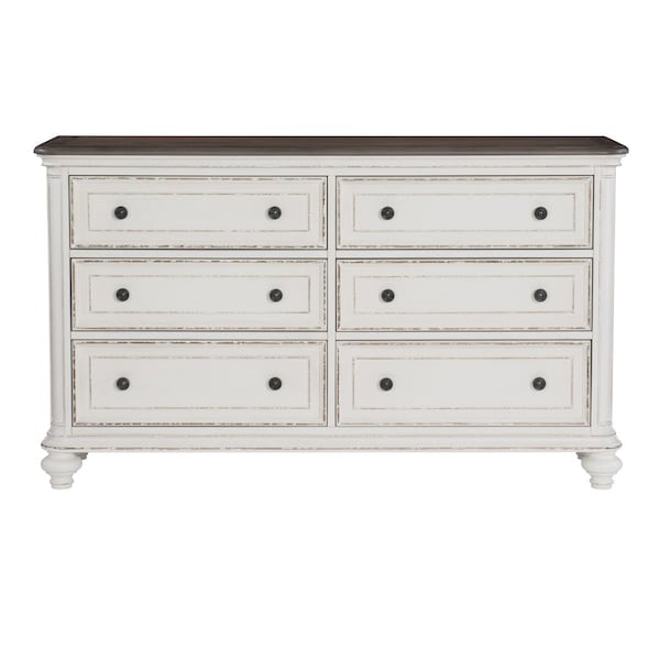 Soft, sweeping curves define the elegant profile of the Baylesford Collection. The dresser is softened by an antique white rub-through finish with a brown-gray finished framed-plank top, creating a romantic aesthetic will place beautifully within your bedroom. Dark finished metal knob hardware provides complementing contrast to the drawer fronts.