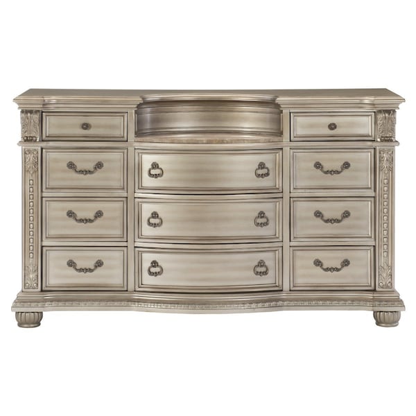 The Cavalier Collection exemplifies the finest in Old World European design inspiration. Egg and dart base moldings, bead molding, acanthus leaf carvings, and genuine marble inset top all blend to achieve an elegant addition for your traditional bedroom. The dresser's beautiful details are accented by the silver finish on birch veneer.