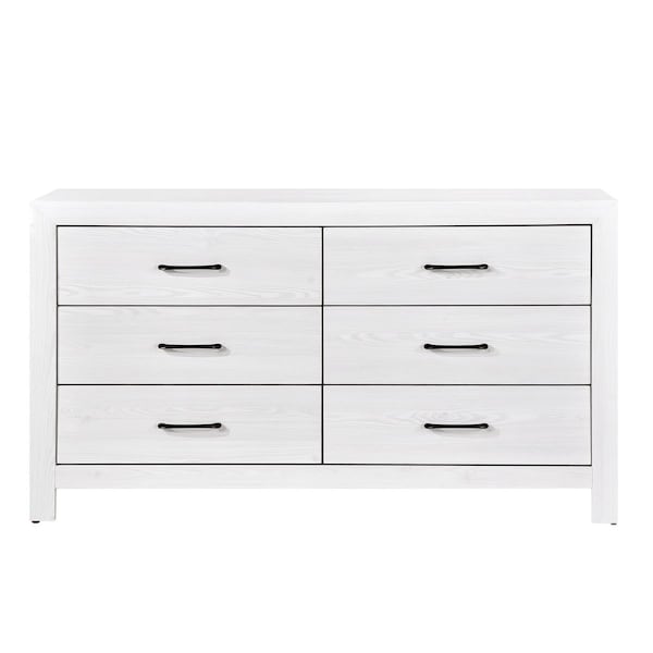 Modern lines and rustic styling are paired to create the look of the Corbin Collection. The 3D printed paper veneers texture is highlighted by a white finish for a realistic wood look. Providing complementing contrast, the drawer fronts of the dresser feature black metal hardware. Subtle framing defines the profile of the dresser, further lending to the unfettered design of the collection.