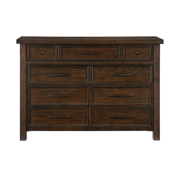 The transitional framing of the Logandale Collection allows for versatile placement within a number of classic bedroom decors, making a perfect choice for your home. A brown finish is utilized over mango veneer for subtle highlighting of its distinct grain. Dark finished metal knob and pull hardware front each drawer of the dresser, creating a complementing accent to the collection.