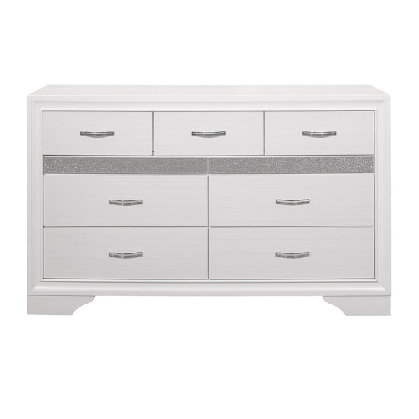 The unique styling of the Luster Collection presents a glamorous option for your bedroom. The dresser's embossed faux-wood veneer features a white finish that allows for the acrylic silver glitter front of the hidden jewelry drawer to shine. The jewelry drawer features felt lining to protect your hidden items from wear and tear. Polished chrome bar drawer pulls front the drawers providing complementing contrast to the collection's finish.
