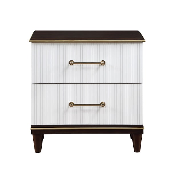 Tasked with executing a design that encompasses the trademarks of contemporary design while including hints at a glamorous lifestyle, the Niles Collection perfects the look. Brushed gold-tone knob and bar hardware radiate from the two-tone white and cherry finish of the collection, the dramatic combination creating an elegant statement of design perfection. Routed panels front the nightstand while gold-finished trim further accents the piece.