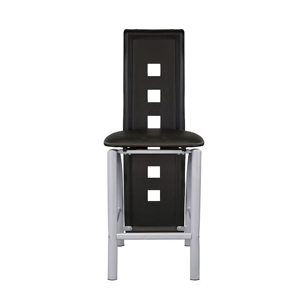 Ultra-modern styling is executed flawlessly in the design of the Sona Collection. Immediately drawing your attention and providing stylistic drama to the casual dining group is the silver finished metal legs and elongated cut-away black faux leather backs of this counter height chair.