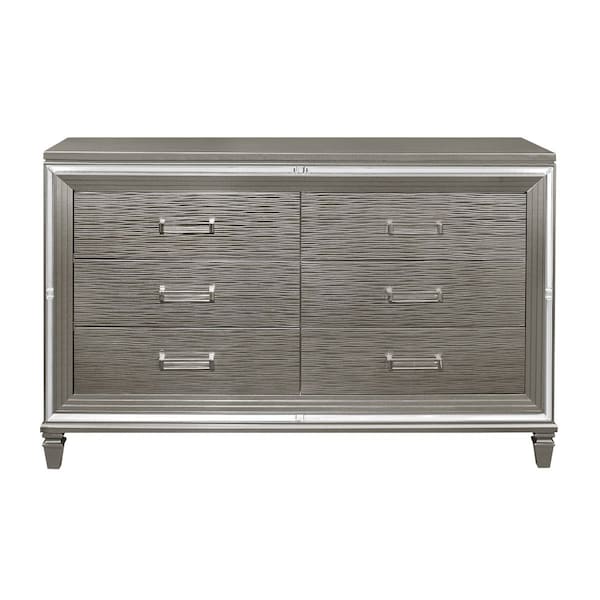 Designed to help your bedroom reach its full glamorous potential, the Tamsin Collection's unique attributes blend to create a stylish and functional addition to your lifestyle. Mirrored framing provides dramatic enhancement to the dresser, illuminating the silver-gray finish. Acrylic hardware provides unobtrusive decorative touch to the drawer fronts of the dresser. Hidden jewelry drawers in the dresser create discrete storage space for your fancy accoutrements.
