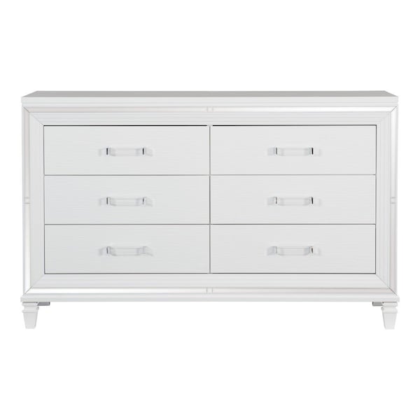 Designed to help your bedroom reach its full glamorous potential, the Tamsin Collection's unique attributes blend to create a stylish and functional addition to your lifestyle. Mirrored framing provides dramatic enhancement to the dresser, illuminating the white finish. Acrylic hardware provides unobtrusive decorative touch to the drawer fronts of the dresser. Hidden jewelry drawers in the dresser create discrete storage space for your fancy accoutrements.