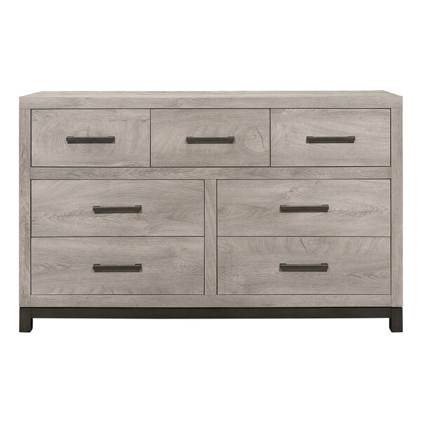 The sleek design of the Zephyr Collection pairs clean lines with modern convenience to create a style that will be the perfect palette for your design aspirations. Visually tying the dresser together are the painted metal-finish banding of the base rail and the metal bar hardware that fronts each drawer, culminating in an accenting contrast to the gray faux wood finish of the melamine veneer.