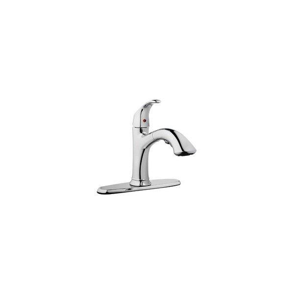HomePointe, Chrome Finish, Single Loop Handle Pull Out Kitchen Faucet, 1.8 GPM, Ceramic Disc Cartridge, 1 Or 3 Hole Installation, Brass Waterway, Braided Black Nylon Hose, Replacement Single Handle Ceramic Cartridge, Meets California AB1953 No Lead Standard.