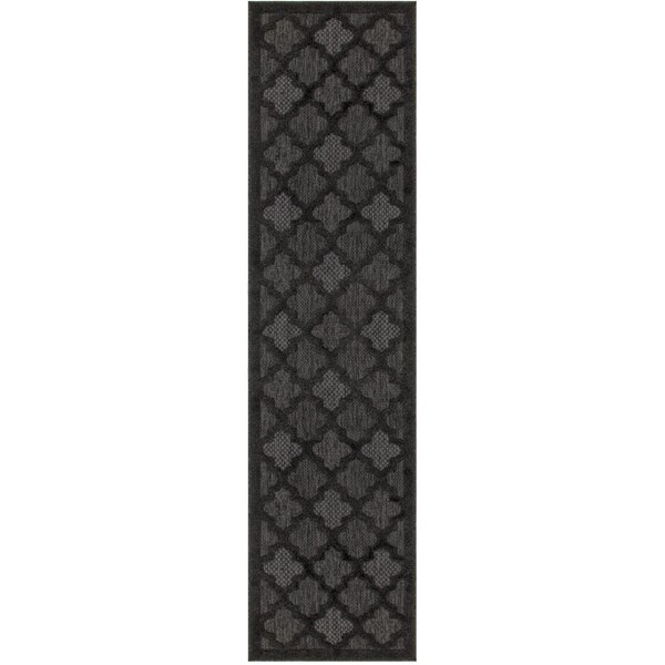 Set an inviting tone in your space with this 10-foot charcoal and black trellis indoor outdoor runner rug. This runner shaped rug features a trellis design that will work well both indoors or out. A classic shape marries with good looking design for your living room, hall, bedroom, porch, patio, or poolside. Makes a great way to dress up your patio, porch, or poolside, but also works well as a durable and easy to maintain option in the kitchen, family room, or mudroom. 26-inch h x 120-inch w x 0.3-inch d.