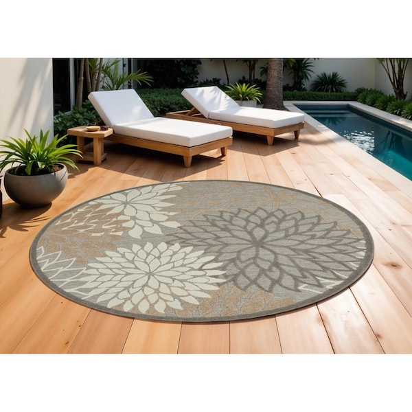 Add great coloration and comfortable texture to your space with this 10-foot gray and ivory indoor outdoor area rug. This geometric round shaped rug features a floral pattern in gray and ivory that combines a good looking print with a unique and updated shape. The mix of shape, color, and design gives this rug refreshing visual interest. Ideal for outdoor spaces or high traffic areas with kids and pets, this rug is made from heavy duty polypropylene that is stain resistant to help repel water, dirt, and stains. Versatile in use, durable, and easy to maintain, this rug is an ideal solution to add a decorative and inviting touch to your indoor or outdoor space. 120-inch h x 120-inch w x 0.25-inch d.