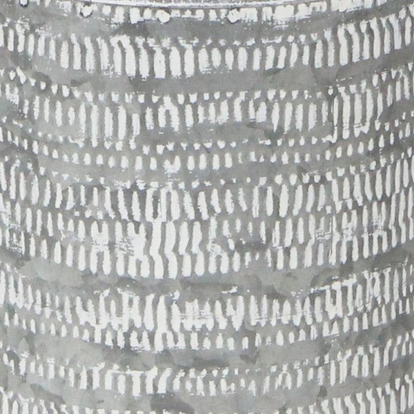 With or without flowers, this 10-inch gray galvanized steel geometric patterned cylinder jug vase makes a great gift or decorative accent for your space. The purposeful whitewash and distressed finish adds a touch of rustic charm and unique character to any decor. Crafted from durable galvanized steel, this jug vase brings both style and resilience to your home. Its cylinder shape allows for versatile display options, creating an eye-catching focal point in any room. Perfect for adding a touch of rustic, boho chic flair to various interior styles, this vase is a must-have addition. 10.25-inch h x 5.25-inch w x 5.25-inch d.