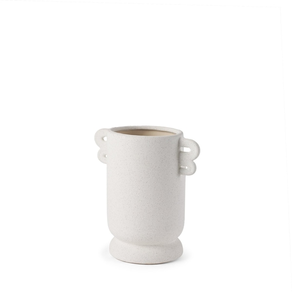 Ideal for displaying fresh or dried flowers, it effortlessly elevates your home ambiance. This table vase features a textural cylinder shape with double handles, that brings a modern touch to any space. Crafted from durable ceramic, it combines beauty and functionality seamlessly. The purposeful coat/paint distressing adds an artisanal flair, making each piece unique and charming. Designed to be watertight, you can confidently showcase your favorite blooms without worrying about spills. Whether placed on a tabletop or a shelf, this vase is perfect for enhancing your decor and making a stunning statement in your home. Its elegant lines and textured finish create a sophisticated focal point in any room. 10.00-inch h x 9.50-inch w x 6.25-inch d.