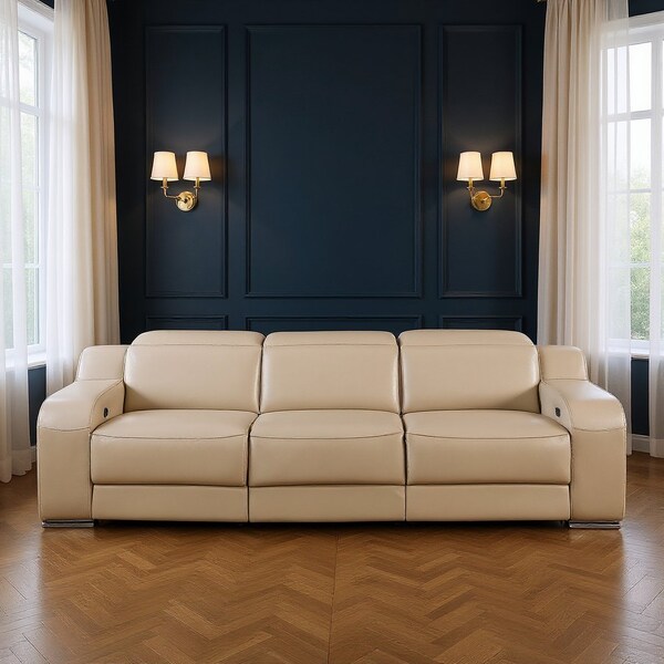 Made of the highest quality, supple leather, this 103-inch beige Italian leather reclining USB sofa will be the star of your space. The premium leather used makes your lounging luxuriously comfortable and adds an elegant appeal to your space. Three power recliners, adjustable headrests, and pocket spring construction give this piece strong support and makes it comfortable to sit even for long periods of time. Fixed arms offer a comfy place to rest. Clean lines and silver stainless steel legs effortlessly elevate the room and add a touch of contemporary design. A great showpiece for your room, this sofa is a must have. 30-inch h x 103-inch w x 41-inch d.