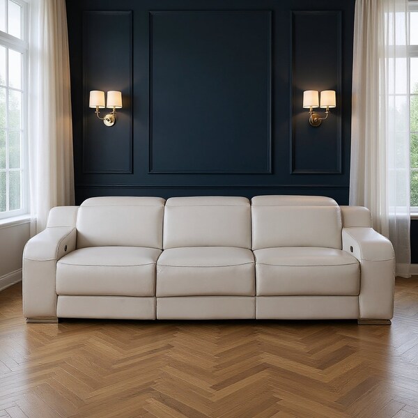 Superior construction from fabulously soft and high grade leather gives this 103-inch light gray Italian leather reclining USB sofa with silver legs a leg up on the competition. The premium leather used makes your lounging luxuriously comfortable and adds an elegant appeal to your space. Dual power recliners, adjustable headrests, and pocket spring construction give this piece strong support and makes it comfortable to sit even for long periods of time. Fixed arms offer a comfy place to rest. Clean lines and silver stainless steel legs effortlessly elevate the room and add a touch of contemporary design. A great showpiece for your room, this sofa is a must have. 30-inch h x 103-inch w x 41-inch d.