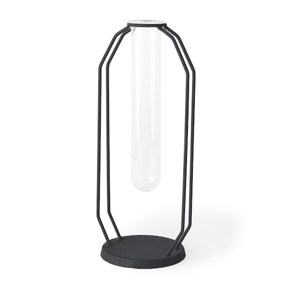 This 11-inch black and clear glass and metal table vase is the perfect accent for your living room, bedroom, dining room, or lounge. Crafted with a striking combination of glass and metal, it exudes a modern elegance that complements any decor style. The sleek design and contrasting colors create a captivating focal point whether filled with fresh flowers or displayed alone. Its versatile size makes it easy to place on a variety of surfaces, enhancing the overall ambiance of your space while showcasing your personal taste in home decor. Elevate your interior aesthetics with this stunning piece. 11.02-inch h x 4.72-inch w x 3.94-inch d.