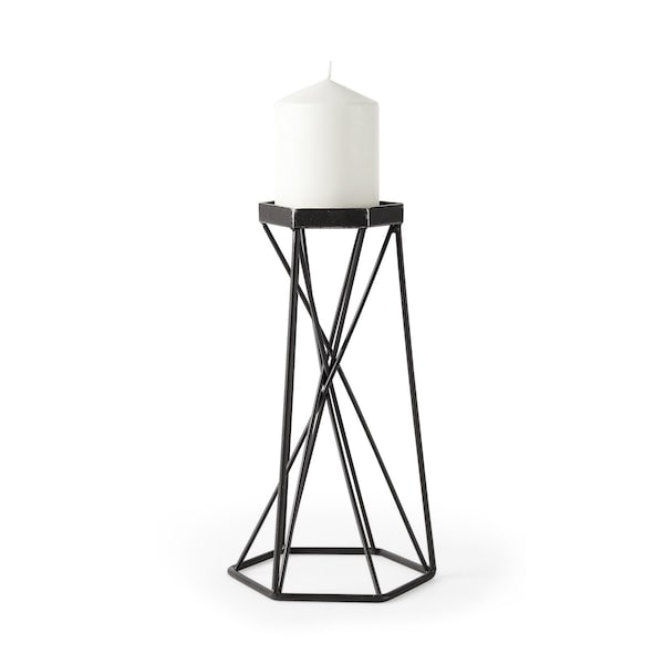 Bring the romantic glow of candlelight to your tabletop with this 11-inch black distressed geometric metal tabletop pillar candle holder handmade by skilled craftsmen and designed to add a glamorous glow to any event or table setting. Add an extra pop of personality to every corner of your home with this gorgeous candleholder candleholders are a decorative accent on their own. With our without candles. 11.02-inch h x 5.32-inch w x 6.1-inch d.