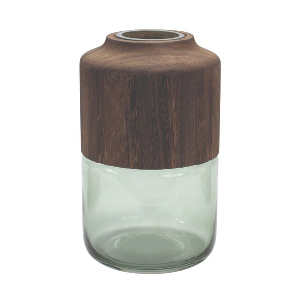 This 11-inch brown and sage glass round table vase with wood is the perfect accent for your living room, bedroom, dining room, or lounge. Its elegant design seamlessly blends modern aesthetics with natural elements, creating a striking two-tone, two material, focal point in any space. The round cylindrical shape enhances its versatility, making it suitable for various floral arrangements or as a standalone piece. The subtle earthy tones complement a range of decor styles, adding a touch of sophistication and warmth to your home environment. 11.00-inch h x 6.50-inch w x 6.50-inch d.
