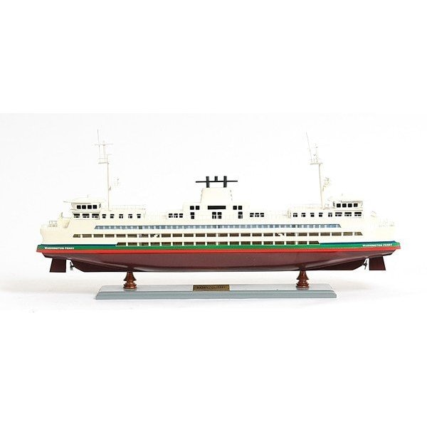 A magnificent piece of Washington's history, the Washington Ferry Model is a uniquely realistic replica. Handmade by the most talented craftsman using high-quality wood and painted in authentic red, green, and white colors. It includes a four-level deck with many intricate details, stairs, and a metal propeller in the back. It comes with a beautiful solid wood base and a brass nameplate, making it perfect for display. With its quality craftsmanship, it is a sought-after piece for any collector or enthusiast. 11" H x 25" W x 5" D
