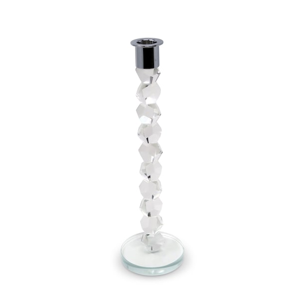 11" Clear And Silver Geo Stacks Crystal Tabletop Taper Candlestick