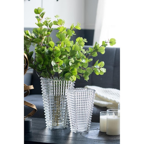 The 11-inch clear glass geometric textured table vase is a stunning centerpiece that enhances any decor. Crafted from high-quality glass, this vase showcases a sleek rectangular shape that adds a modern touch to your home. Its contemporary style makes it versatile, perfect for a variety of settings, from elegant dining tables to chic living room displays. Use it to showcase your favorite flowers or as a stand-alone decorative piece that draws attention. This table vase brings both beauty and sophistication, serving as an ideal addition to your home decor collection. Enhance your space with this exquisite piece that effortlessly complements your personal style while providing a clean and polished look. 11-inch h x 6.5-inch w x 4.7-inch d.