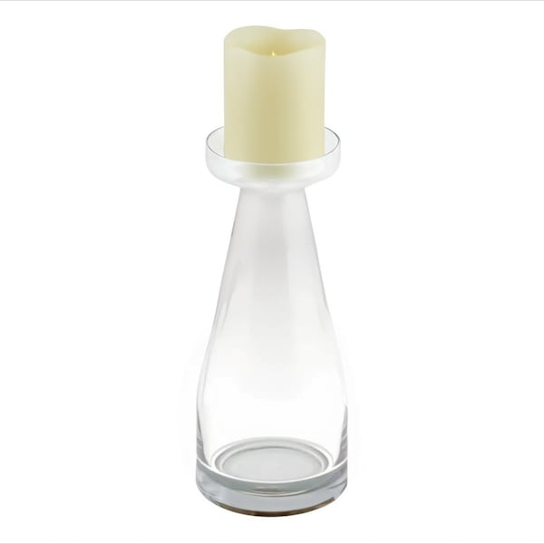 This 11-inch clear glass centerpiece pillar candle holder with candle is perfect for creating an elegant atmosphere on your tabletop or mantel. Ships with a candle included for added value and ease of use. Dress up your home to impress every season with this fabulous candleholder that can be filled with stones, shells, Christmas balls and more to change up the look and feel of your space. Candleholders are an attractive way to turn a simple candle into a piece of decor. 11-inch h x 5-inch w x 5-inch d.