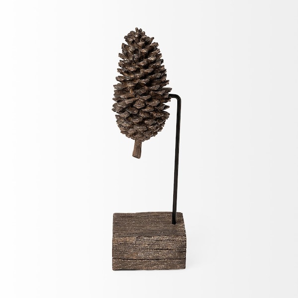 Bring in a nature inspired decor element to your home with this eye-catching 11-inch golden brown resin pinecone tabletop sculpture. The base of this small sculpture features a thick block shape with a metal rod that comes up and attaches to the resin pinecone piece. A dark brown with hints of gold and textural detailing allow this pinecone to bring some depth and dimension to your space along with a rustic outdoorsy vibe. This great accent will bring a sense of earthiness and nature to your space. 11-inch h x 4-inch w x 4-inch d.